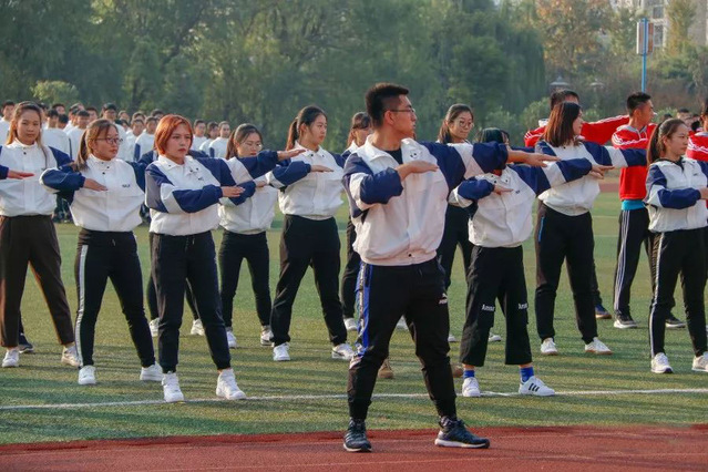 下午两时,比赛在方山校区北操场正式开始。迎着灿烂秋阳,第九套广播体操的音乐激昂响起。我院的同学们身着精心准备的班服,昂首挺胸。伸臂、扩胸、转体、踏步、跳跃……他们的动作娴熟到位,张弛有度,有刚有柔。比赛中,各班同学犹如凝聚在一起的链条,动作整齐划一,齐心协力为班集体乃至新闻传播学院争取荣誉。