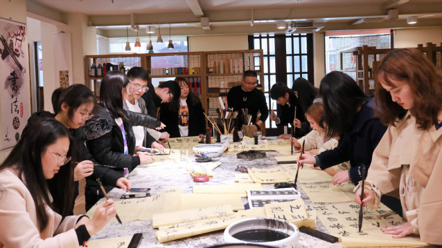 为使学生更好地体验传统文化的魅力,“女子学堂”系列活动之“参观大国书房”日前在丁清老师的随行下开始。11月20日下午,学员们乘车前往位于兴智科技园的大国书房,书房创始人闻院长陪同参观并为大家讲解。“国学讲堂”匾额之下,闻院长强调了书房“国学传承,文化报国”的经营理念。书房里随处可见书法、绘画、陶艺相结合的文创艺术品,而其中很多正是闻院长书法作品的“周边”。隶书、行书、小楷、草书……学员们认真聆听她在书法审美方面的独到见解。