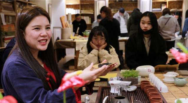 随后学员们在书房中开始了分组体验:书法老师教学员们怎么握笔,下笔;茶师讲了茶的起源,益处和茶具,并且教授泡茶的方法。学员们品茗、写字、下棋,气氛轻松且融洽。
