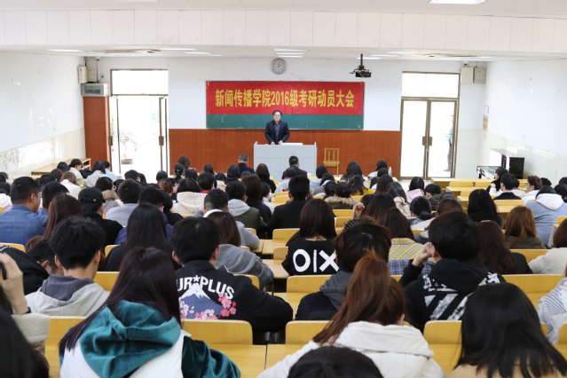 为进一步贯彻落实学校关于教风学风建设工作和进一步加强考研工作的实施意见,3月12日下午,新闻传播学院在莫愁校区3号楼104教室组织2016级学生考研动员大会,学院党政领导、教务办、学工办,2016级各班班主任、考研考编等学生共170人参加大会。