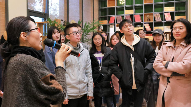 为使学生更好地体验传统文化的魅力,“女子学堂”系列活动之“参观大国书房”日前在丁清老师的随行下开始。11月20日下午,学员们乘车前往位于兴智科技园的大国书房,书房创始人闻院长陪同参观并为大家讲解。“国学讲堂”匾额之下,闻院长强调了书房“国学传承,文化报国”的经营理念。书房里随处可见书法、绘画、陶艺相结合的文创艺术品,而其中很多正是闻院长书法作品的“周边”。隶书、行书、小楷、草书……学员们认真聆听她在书法审美方面的独到见解。