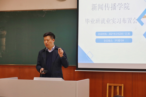 为积极推进疫情常态化管理下我院毕业生就业实习工作,新闻传播学院于2月23日召开2017级毕业生就业实习工作会议。学院党总支书记陈长伟、学院副书记兼副院长饶黎出席会议,学工办副主任嵇娟娟、教务办杨鹏超老师、辅导员王楠楠老师以及毕业班返校生参加此次会议。