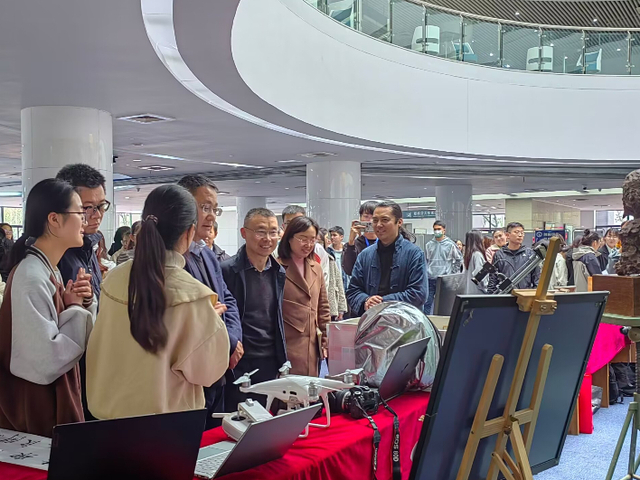 作为开幕式的系列活动之一,在图书馆一楼举办的“强国有我,创意无限”大学生创新实践成果展是展现我校学子创新成绩的重要舞台。我院积极组织学生参与,并通过专业教师推荐和自主申报,遴选出一批能够展现新传学子科技文化创新成果的优秀展品,它们包括《白日梦想家》《世界上另一个我》等优秀摄影作品和创作短片。此外,无人机、单反、摄像机、三脚架、灯光、反光板等新传学子开展创作的重要器械也一并带至现场,前来参观的师生能够在我院解说员的引导下了解文艺作品创新背后的故事。