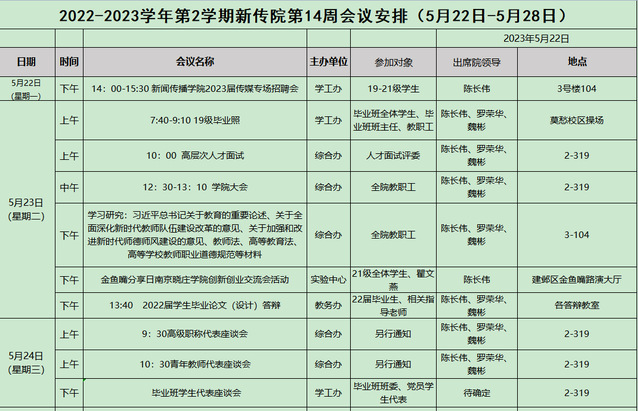 2022-2023学年第2学期新传院第14周会议安排(5月22日-5月28日)