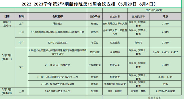 2022-2023学年第2学期新传院第15周会议安排(5月29日-6月4日)