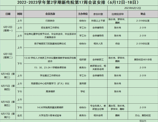 2022-2023学年第2学期新传院第17周会议安排(6月12日-18日)