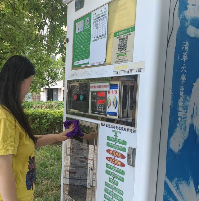 接连下了好几场雨后,社区内公共的售水机上面全部是残留的雨水。为了保证矿泉水的干净卫生以及社区内人们的方便使用,我找来了物业专门擦拭相关器材的用具,将售水机外层擦拭了一边。最开始单纯的擦拭并不能清洁到位,在擦拭过程中,我发现还需要用水冲洗才能去除掉一些印记。在找水管时,旁边放暑假的两三个小学生一直问我做这些的原因和目的。我解答之后,他们就帮我一同寻找,终于在一家地下车库里我们借到了水管。在之后的过程中,我们一起完成了对售水机的清洗。整个流程完成后,其中一个小学生告诉我这是她第一次做这些,她觉得很有成就感,以后也会常来社区中帮忙。我想这就是我们进行社会实践的意义之一。