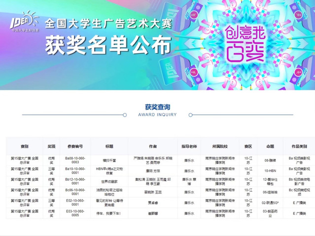 新传院自2019年开始连续组织学生参赛,今年共计获评33个奖项。国赛阶段共获6个奖项,其中康玥、方萍同学的《HBN早c晚a之文物修复》和贾卓睿同学的《看见的彩铃 让等待更有趣》获评国家三等奖,另有4组作品获评国家优秀奖。在国赛之前的江苏省赛阶段,新传院也一举收获27个奖项(包含二等奖4项,三等奖9项,优秀奖14项)。