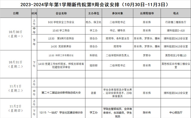 2023-2024学年第1学期新传院第9周会议安排(10月30日-11月3日)