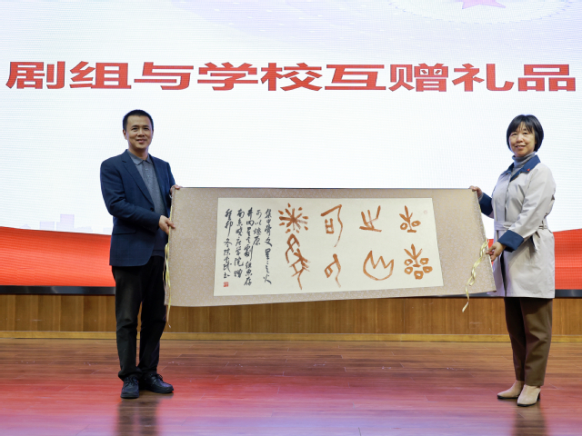 活动伊始,南京晓庄学院党委常委、副校长顾勤为本次活动致辞。顾校长表示,建校96载以来,南京晓庄学院矢志不渝地承载革命历史,延续晓庄十英烈精神,《井冈星火》进晓庄对于本校来说具有非凡意义,她对电影主创团队的到来表示热烈欢迎。紧接着,《井冈星火》导演周耀杰在致辞中表示,新时代青年应传承“捧着一颗心来,不带半根草去”的先驱精神,共同努力奋进,砥砺前行,用青春铸就泱泱华夏。随后,我校与《井冈星火》剧组互赠礼物。刘建勋董事长代表《井冈星火》剧组为我校赠送井冈红旗,我校美术学院陈爱民教授专门为本次活动创作甲骨文书法作品《星星之火,可以燎原》,由顾勤校长代表赠送给《井冈星火》剧组。