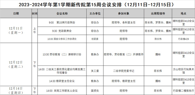 2023-2024学年第1学期新传院第15周会议安排(12月11日-12月15日)