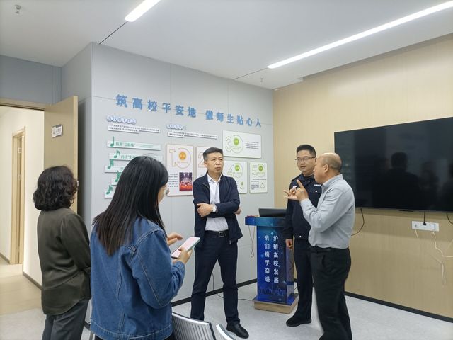 参访过程中,校园警务室负责人张俊警官带领大家参观谈心谈话室、调解室、宣教室等功能室,介绍了警务室的人员配置、组织架构和工作职责以及在校园安全防范、突发事件处置等方面的工作流程。校保卫处负责人结合现场宣传图片详细介绍了近年来学校安全教育工作所取得的一系列成果。最后,双方就学生安全教育、心理健康辅导、突发事件应急处理等方面进行了深入讨论。