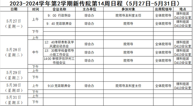 2023-2024学年第2学期新传院第14周会议安排(5月27日-5月31日)