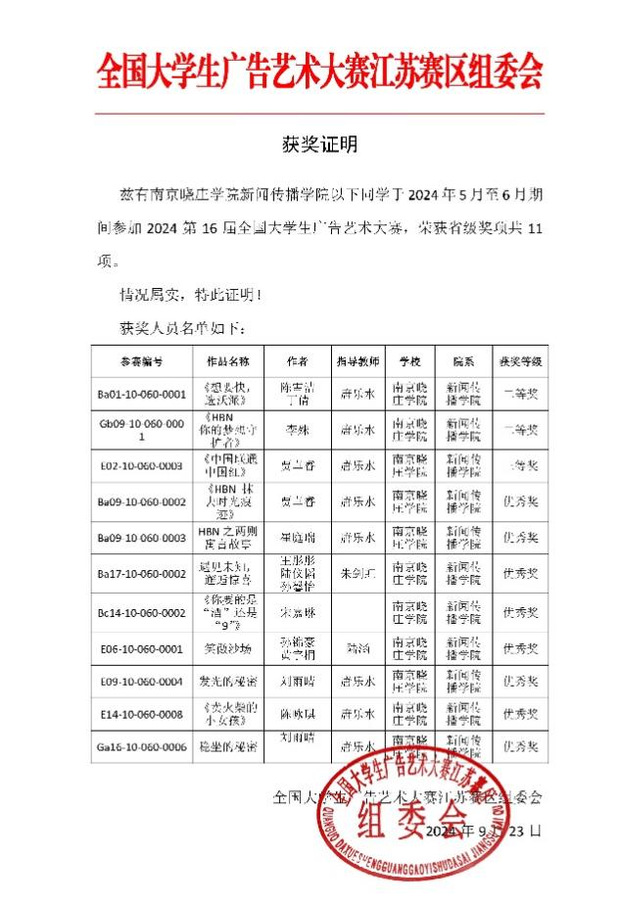 本届大赛中,新传院共计获得13项奖项。刘雨晴的《发光的秘密》以及宋嘉琳的《你要的是“酒”还是“9”》获全国优秀奖,陈雪洁、丁倩的《想要快,选沃派》以及李殊的《HBN——你的梦想守护者》获省赛二等奖,贾卓睿的《中国联通中国红》获省赛三等奖。崔庭瑞、陈咏琪、王彤彤、陆仪韬、孙馨怡、孙锦豪、黄宇桐、刘雨晴、宋嘉琳的作品共计获8项省赛优秀奖。