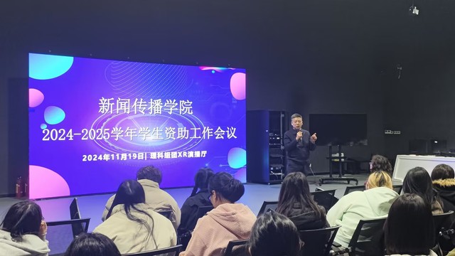 11月19日下午,新闻传播学院在理科组团XR演播厅召开2024-2025学年学生资助工作会议。参加本次会议的有学院党委书记陈长伟、党委副书记昃静、分管资助工作辅导员王楠楠以及学院全体家庭经济困难学生。
