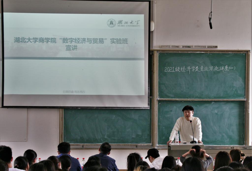 会议伊始,王鹏向与会学生介绍实验班的相关信息。“在此之前,商学院曾经面向全院各专业学生组建过两次实验班”,王鹏介绍道,“经过多方考量,商学院今年将单独面向经济学类专业学生进行遴选,依托国际经济与贸易专业,构建新一届数字经济与贸易实验班。”随后,他就数字经济与贸易实验班的人才培养目标,课程体系以及其较普通班级的优势等方面展开了详细介绍。