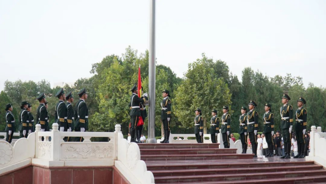 晨光中,国旗仪仗队的队员们迈着铿锵有力的步伐走向升旗台,在激昂的国歌声中升起鲜艳的五星红旗。师生们高唱国歌、庄严肃立,向冉冉升起的五星红旗行注目礼,以崇高的敬意向国旗、向伟大祖国致敬。