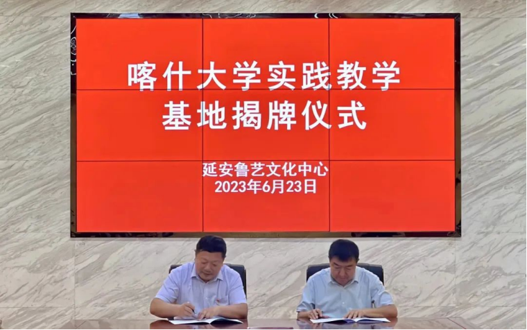 仪式上,喀什大学党委常委、宣传部部长丛培兵与延安鲁艺文化中心主任刘妮共同为实践教学基地揭牌,并与延安鲁艺文化中心副主任侯海成签订了合作协议。