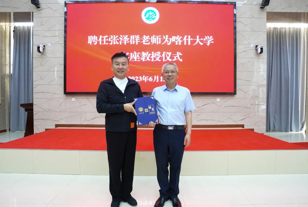 在聘任仪式上,丁邦文为张泽群颁发了聘书,并对张泽群心系新疆的高尚情怀表示敬意和对喀什大学的关心关切表示谢意。希望能以此为契机,提升学校相关专业的教育教学水平和学生培养质量,促进文化润疆工程落地生根。