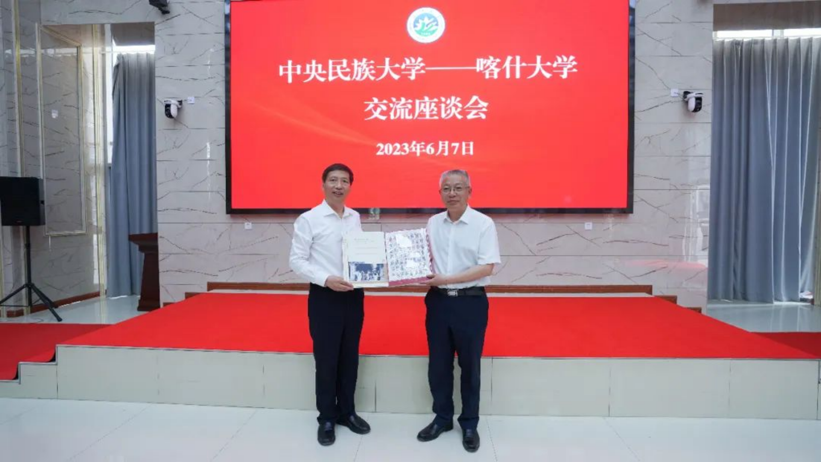 座谈开始前,双方举行了中央民族大学(喀什大学)铸牢中华民族共同体意识研究基地揭牌仪式。