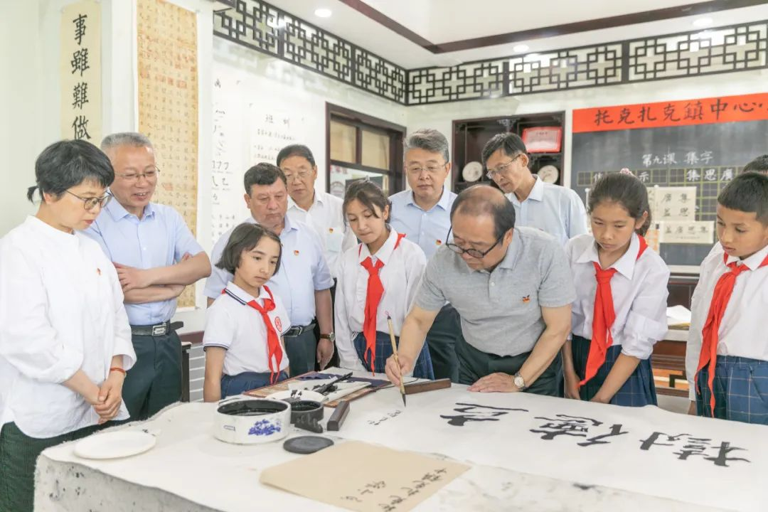 参观前,我校美术与设计学院党总支副书记、院长薛云祥向托克扎克镇中心小学捐赠了中国画作品并签订了合作协议。在学校书法教室,薛云祥现场为托克扎克镇中心小学题字。
