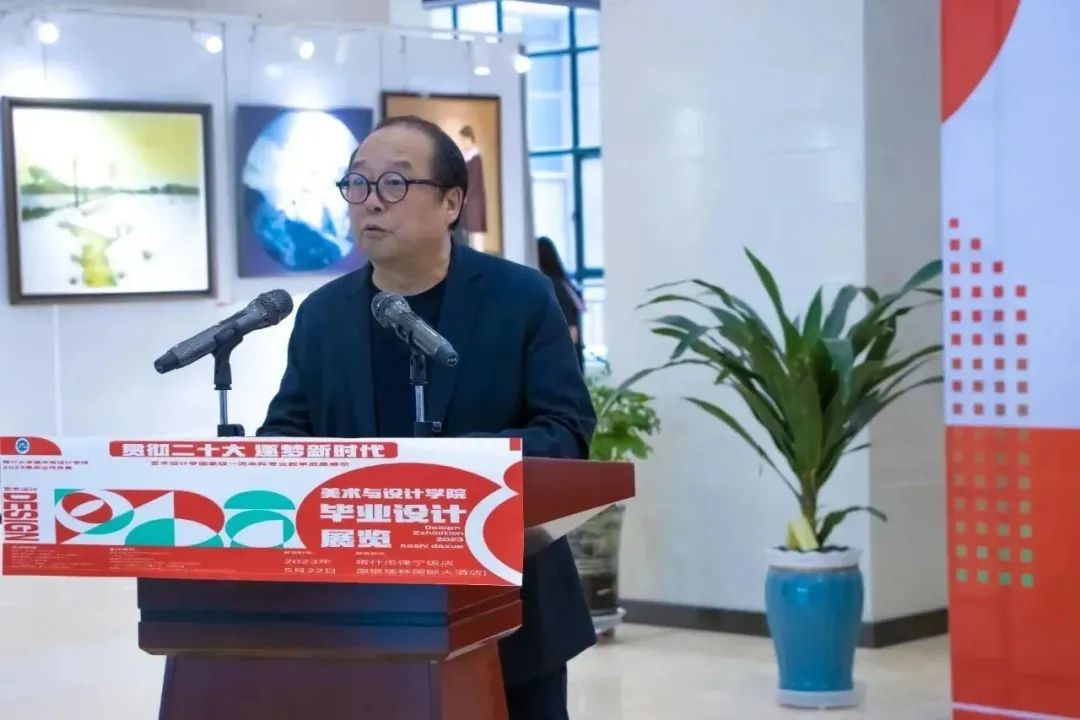 5月24日,我校美术与设计学院在新泉校区图书馆南门一楼举办了“贯彻二十大·逐梦新时代”2023届毕业生作品展开幕式,校党委书记丁邦文出席并讲话,在家校领导班子成员、美术与设计学院师生参加开幕式。