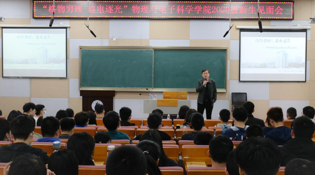 周斌就物电学院历史底蕴、学习风貌、特色学科进行介绍。他说:“要培养学科兴趣,唯有热爱才能不断产生奋斗的源动力去实现理想,大学是一个全新的价值评价体系,除了关注自己的学习成绩,还应提升核心素养。”他以物理中水变冰,冰变水的相变引出人生的思考,希望同学们通过思考树立独立的人格,成为一个有智慧的人,进而迸发出自己的激情,在青春年华里绽放属于自己的精彩,发出属于自己的光亮。