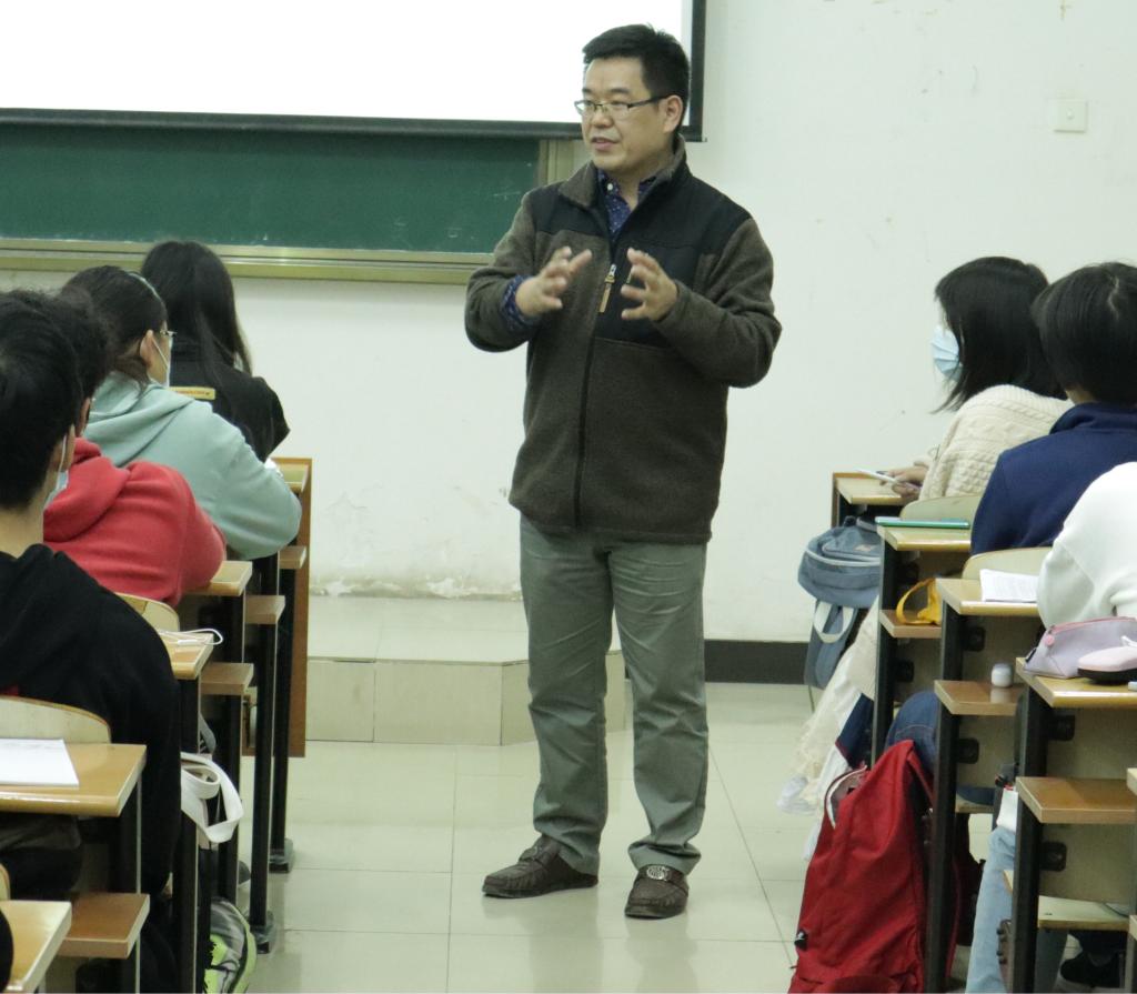学业指导开始之前,梅勇播放了一个全英文影片片段,巧妙地引入课堂,接着用一个ppt向学生们进行自我介绍。他以一句:“I’m so happy to meet you here.” 活跃了讲座的气氛,在座学生纷纷仰身倾听。
