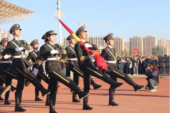 晨光中,国旗仪仗队迈着铿锵有力的步伐走向升旗台,在激昂的国歌声中升起鲜艳的五星红旗。师生们高唱国歌、庄严肃立,向冉冉升起的五星红旗行注目礼,向国旗、向伟大祖国致敬。