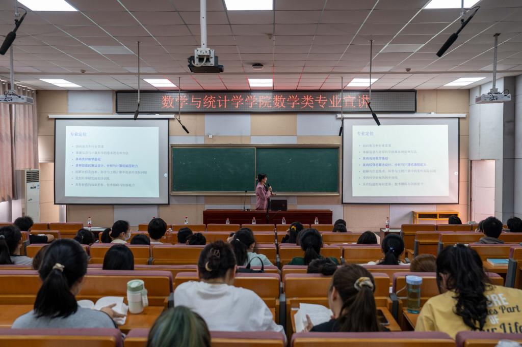 数学与统计学学院专业的宣讲以专业宣讲与导师答疑相结合的模式展开,旨在解答学生面临专业分流问题时的困惑,使学生对各细分专业的竞赛、考研、就业前景有更好了解。各位老师在宣讲和答疑过程中对各细分专业进行了介绍,包括专业必备专业素养、专业课程体系、学院合作企业、学科竞赛几大方面。刘展表示应用统计专业侧重培养学生将统计学分析原理、技术应用于国民经济发展的能力。付敬辉则告诉学生信息与计算科学专业更注重数学基础强化及学科交叉运用的能力,为学生专业选择提供参考。几位老师均强调了数学竞赛对各细分专业的重要性并着重介绍了大学生数学竞赛这一赛事对保研、就业、专业素养提升具有重要作用。