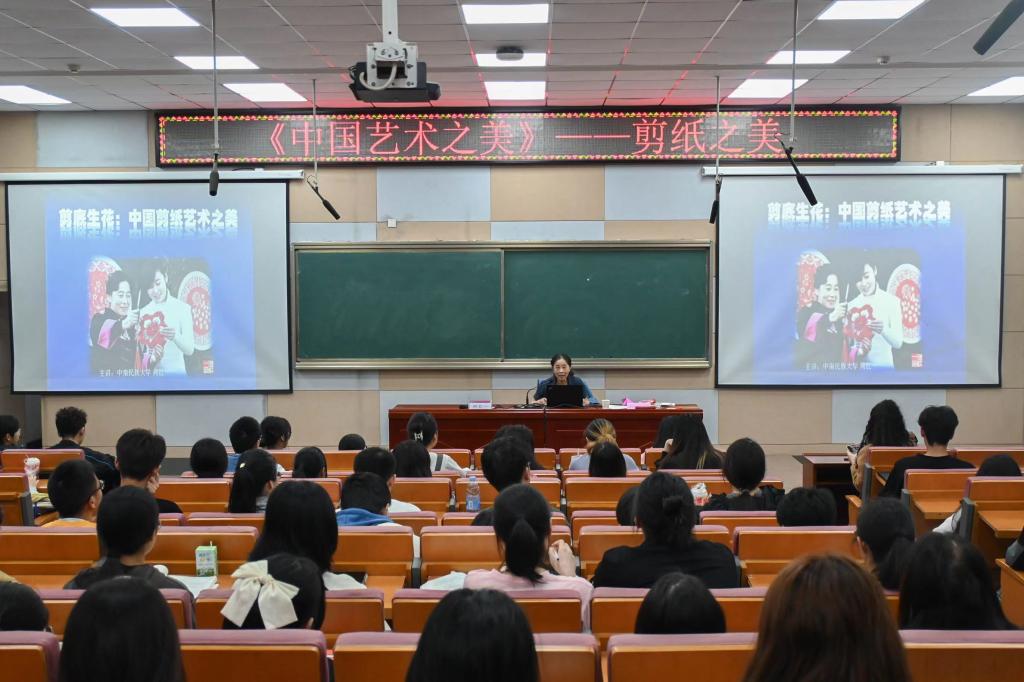 4月22日上午,湖北大学通识教育选修课“中国艺术之美”在阳逻校区顺利结课。中国剪纸学会常务理事、中南民族大学文学与新闻传播学院何红一教授,应邀作该课第八讲——剪纸之美。