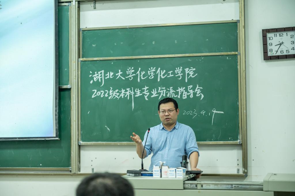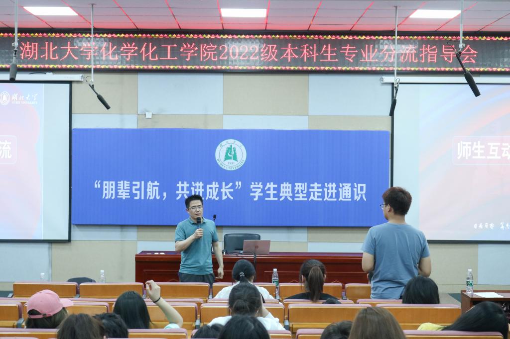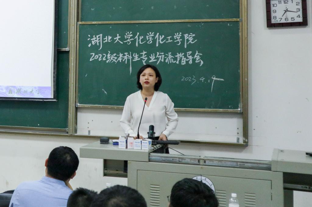 “不管你们以后选的是哪个专业,都希望你们把理想装在心中。”4月19日晚,湖北大学化学化工学院2022级本科专业分流指导会在通识教育学院B212和B300教室正式开始。化学化工学院党委书记林二友、院长张修华,教授李玲,副教授李法宝、刘建文、龙牛丽、潘洁、翁玥、汪航行,教学秘书徐伟龙出席活动,大四学生代表以及2022级化学化工学院的全体学生参与活动。