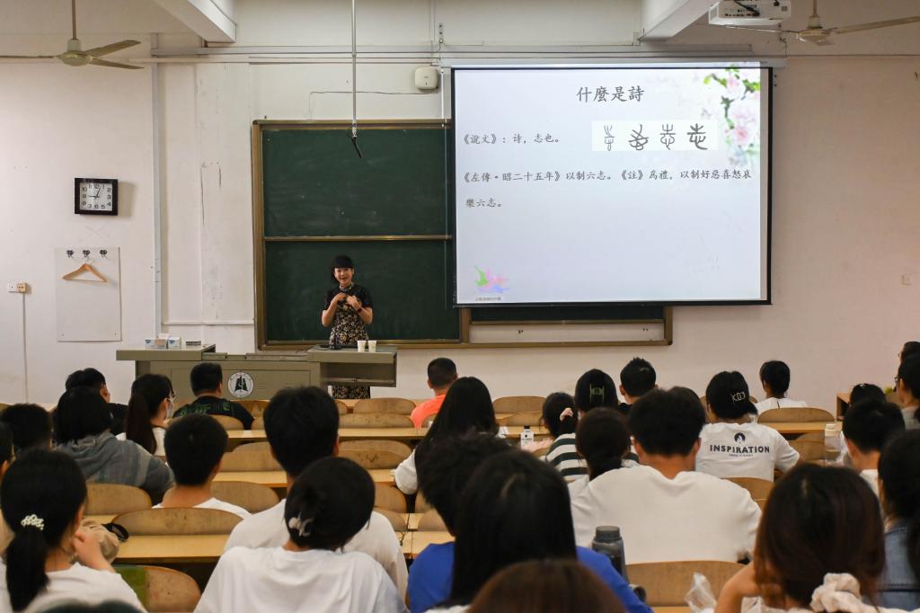 课上,许可秋以中国古典诗歌的音韵美为主题,从“诗”的小篆字形为切入点,对诗的本义、诗的基本规则进行阐释。她朗读了我国典籍里最早的一首古老歌谣《弹歌》,“断竹,续竹;飞土,逐宍。”这让同学们体会到了诗歌字句简短、语言古朴和节奏明快的特点。