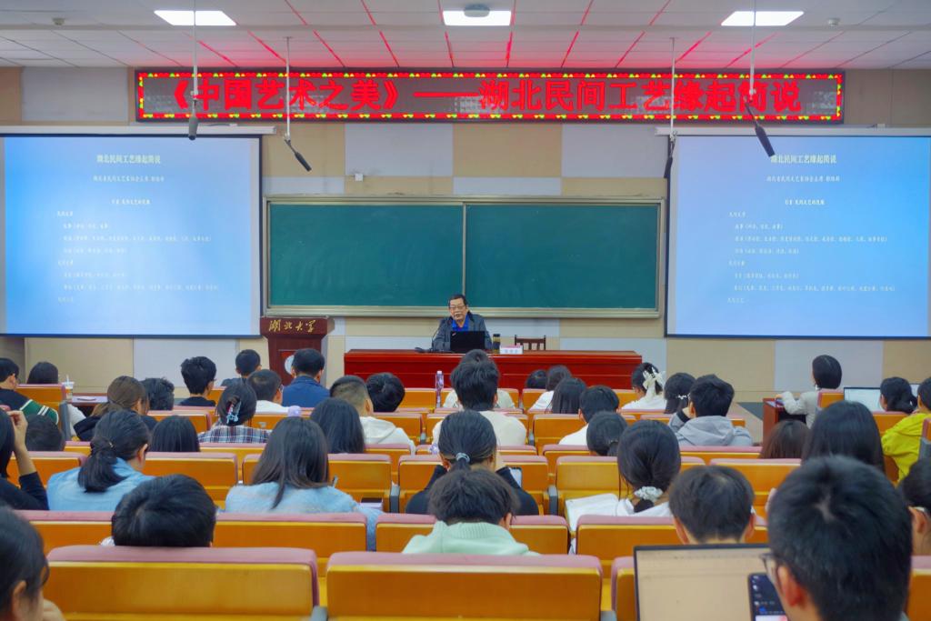 11月4日上午,湖北省民间文艺家协会主席鄢维新应邀到湖北大学阳逻校区讲授本学期通识教育选修课《中国艺术之美》第三讲——“湖北民间工艺缘起简说”。