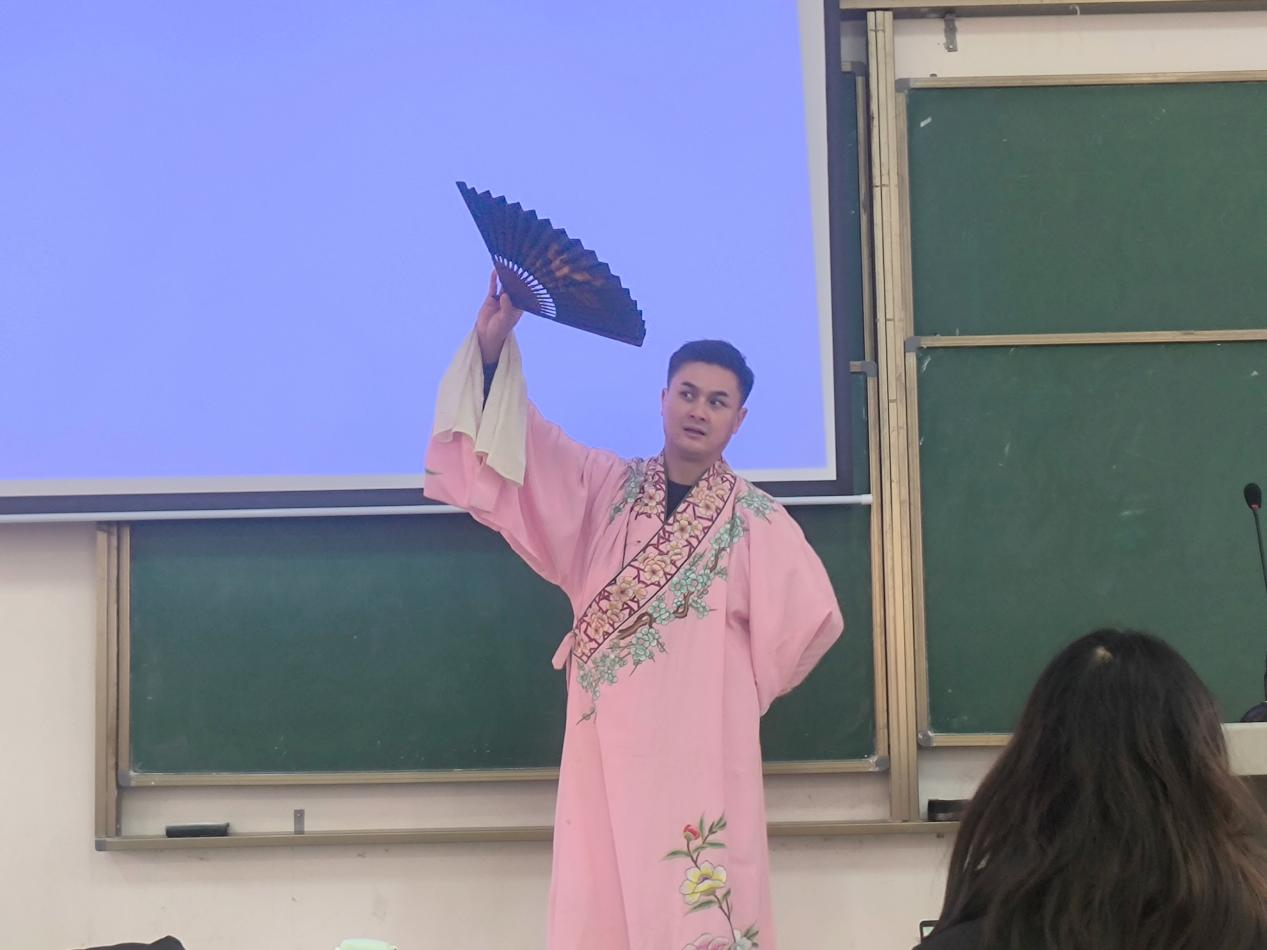 跨步、抬扇、仰头……经过陈晓檬精心设计的一套动作,“官生”、“书生”、“穷生”三个角色被刻画得入木三分,牢牢抓住了学生们的眼球。“戏曲是一种具有独特表演和演唱风格的艺术形式,包含‘生’‘旦’‘净’‘末’‘丑’五个角色。”陈晓檬还就自己的“小生”身份,为学生们细致分享了“生”这一角色所包含的类别。