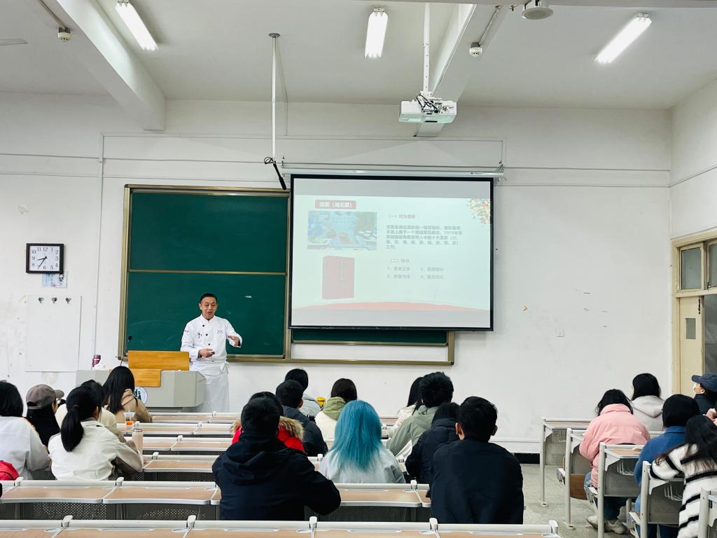 “鱼米之乡、蒸煨擅长、鲜香为本、融合四方”,郭方斌以自己再熟悉不过的楚菜为切入点,由此一步步展开讲解我国主要地方菜系的特点。麻辣的川菜、咸鲜的鲁菜、精致的粤菜等,通过幻灯片逐一向大家展示,引得在场学生垂涎三尺。