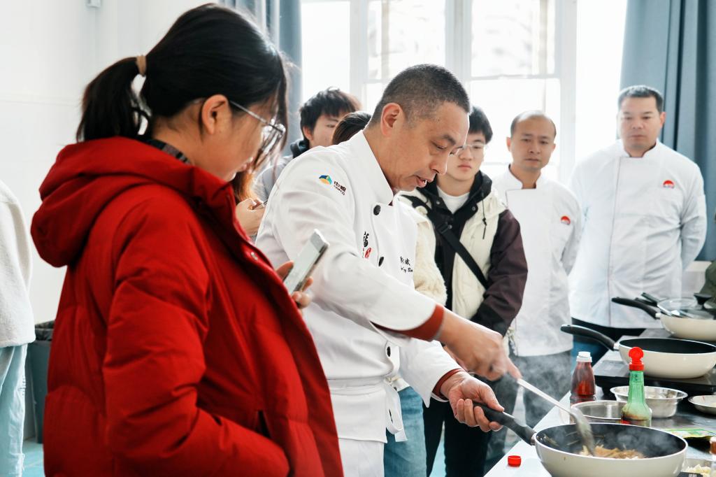 接着,刀工展示,也是学生实践环节。在郭方斌与其团队的指导下,学生们有条不紊地切好土豆丝、青椒丝和肉条,备好姜蒜与调料。然后,时刻提醒学生掌握火候,在锅内的油烟冒起时倒入锅中翻炒。他们挥动锅铲,全神贯注地投入烹饪。
