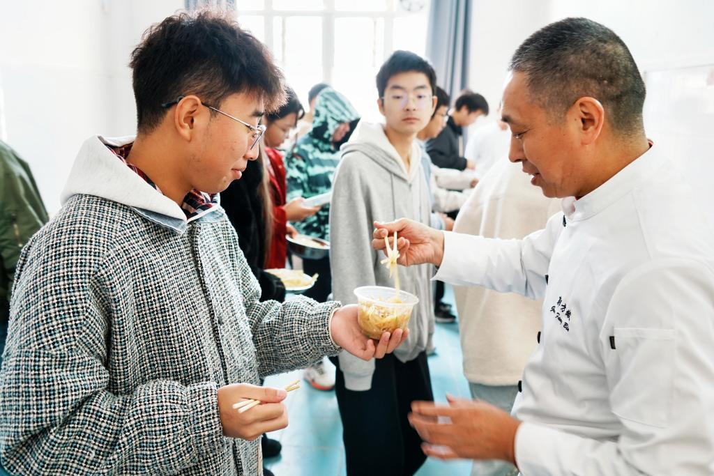 “今天来教同学们如何炒土豆丝和青椒肉丝。”郭方斌为大家做现场示范,他技艺娴熟,整套动作行云流水,学生们目不转睛。