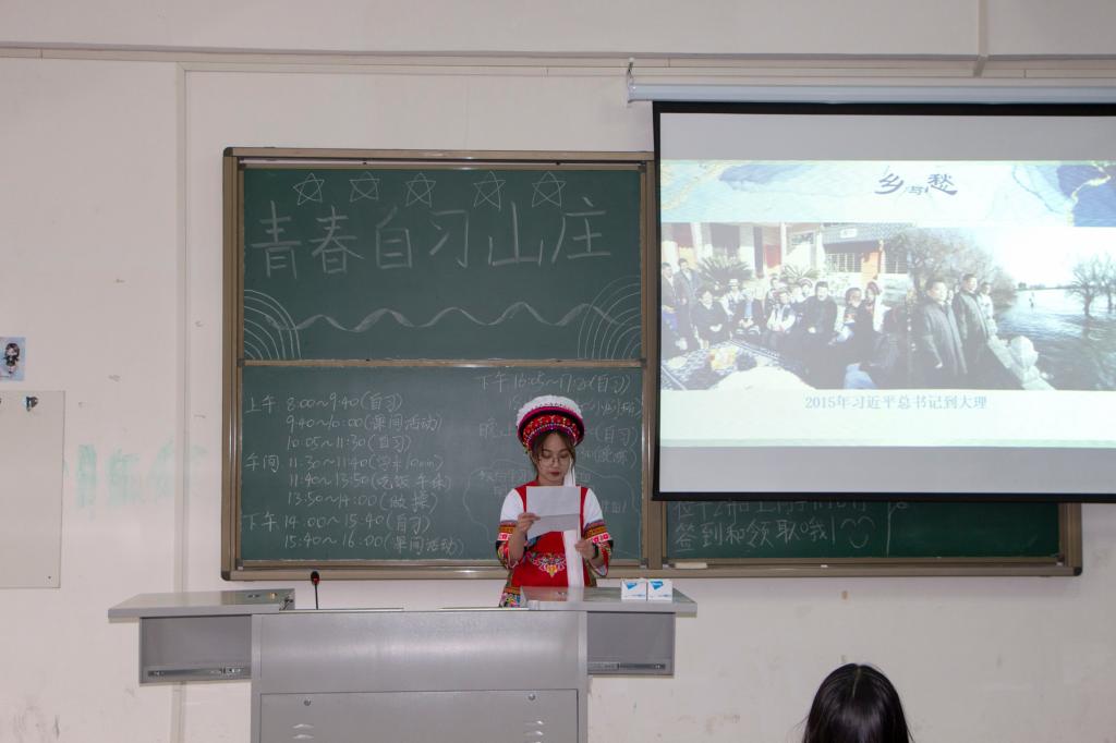 中国语言文学类专业学生王逸菲身着白族传统服饰,娓娓讲述自己入学以来对家乡的思念。这身衣服是她从家乡带来学校的,它象征着大理著名景观:上关花、下关风、苍山雪与洱海月,借以寄托乡愁。王逸菲热爱文学,她希望能够通过写作表达对家乡的爱,也希望能在文学的路上走得更远更好。