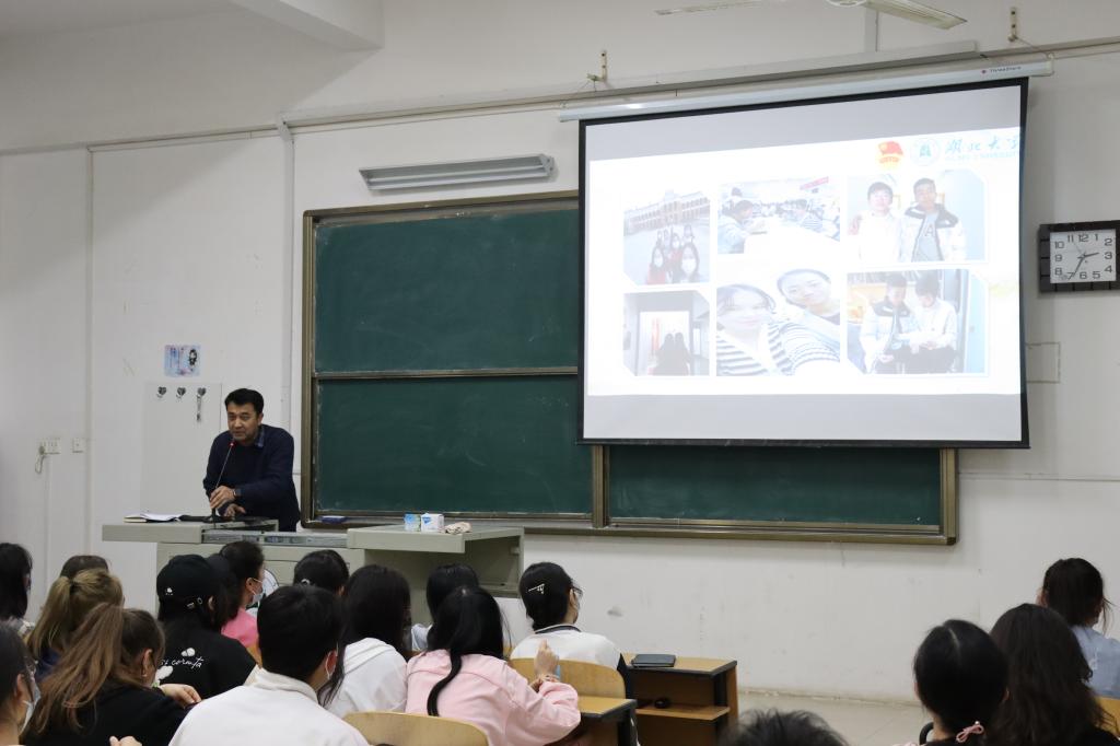 艾麦提江老师在会议开始简要介绍了本次活动的主题、指导思想和活动目的,放映了《新闻联播—全国民族团结表彰大会》的相关报道,带领同学们学习全国民族团结工作会议精神。