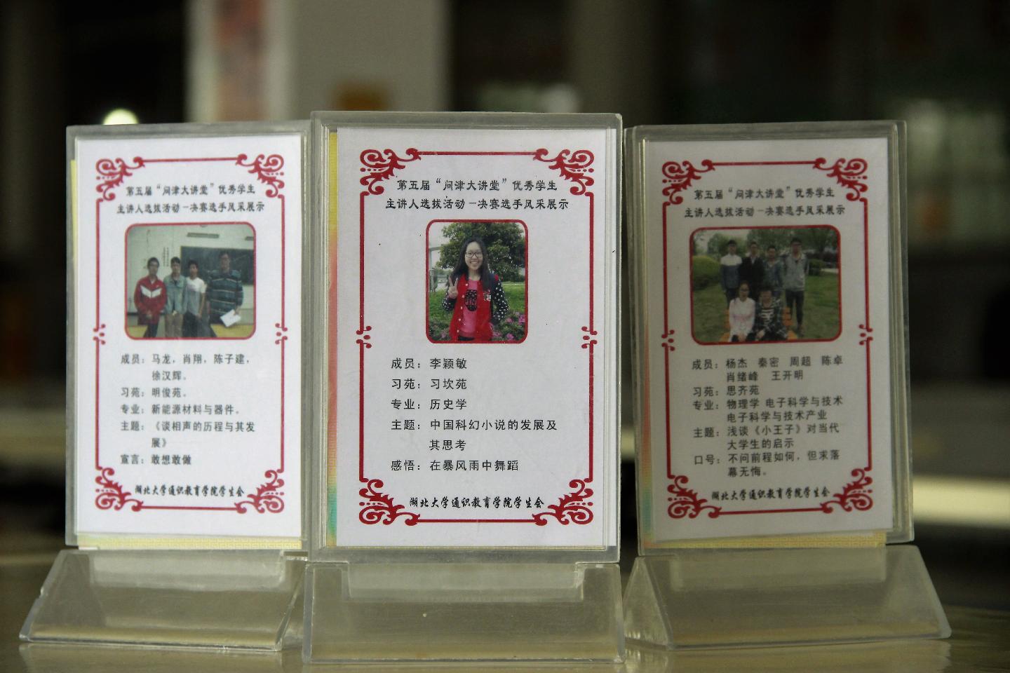近日,在学院问津食堂,可以看到68个团队及个人的照片、学生简介和参赛感悟等内容以卡片的形式被摆上了餐桌,学生吃饭时,抬眼就可以看到附近餐桌上摆放的主讲人的介绍。据此次学生主讲人活动的主要负责人明鑫介绍,问津主讲人卡片进食堂的形式是本届的创新之举,不仅对即将进行的决赛起到了十分广泛、良好的宣传作用,也是对选手们的一种鼓励与支持;因为形式便捷,受众广,收获的效果也非常好。除了一楼,在问津食堂二楼的教工用餐区,也有部分优秀主讲人的展示卡,“这样可以让学校老师也见识一下我们学生的风采与活力嘛!”明鑫如是说。