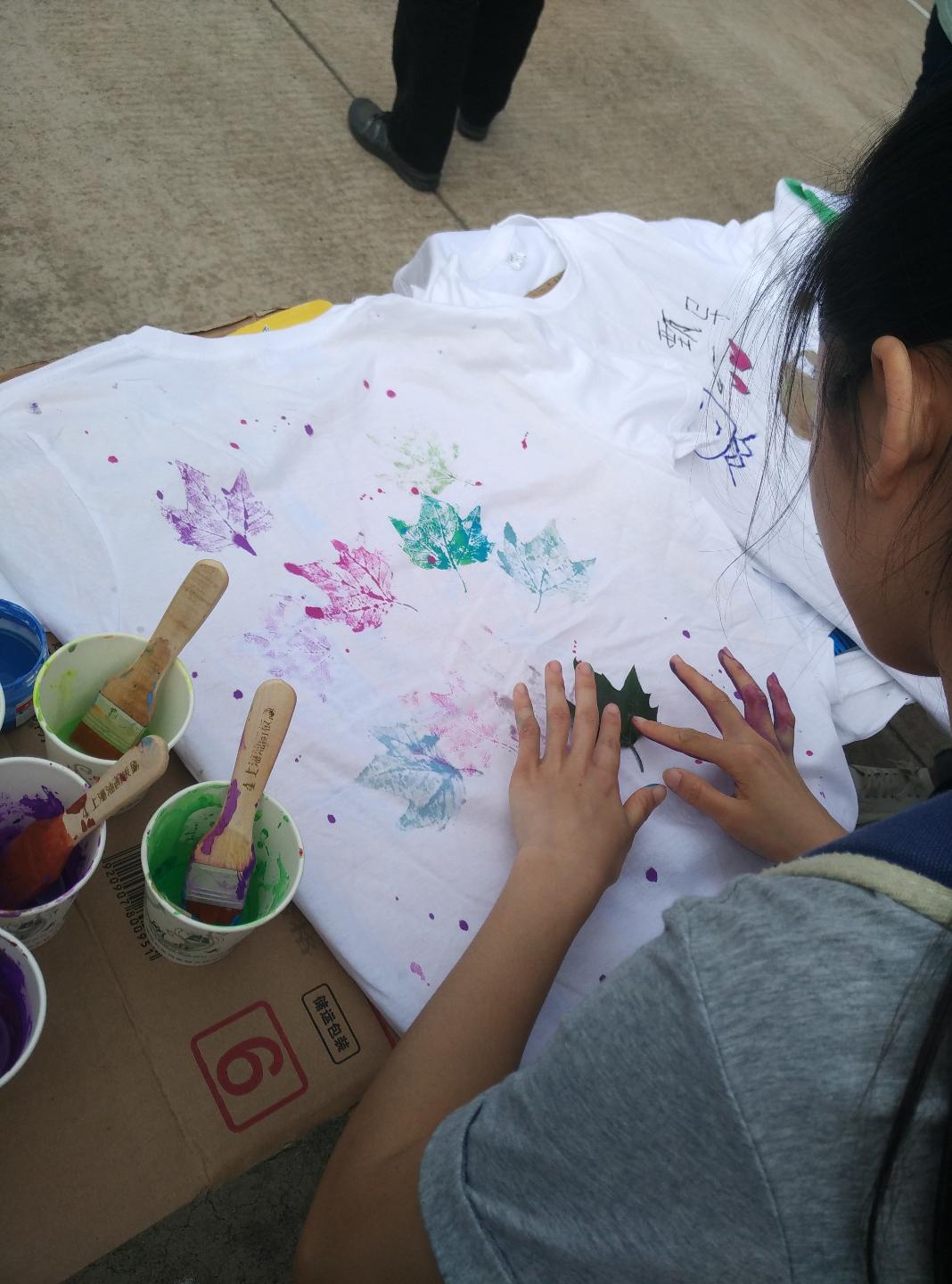 各习苑的学生也都乐在其中。思齐苑的学生一个个不知不觉都画花了脸,笑着互相涂抹着颜料。明俊苑的T恤创意设计吸引了不少人驻足,材料化学专业的代舒文画上了日前大热的宋仲基,她说到:“甄导和仲基欧巴一样帅!”另一位高分子材料专业的王纯借用了一旁地上的树叶,涂上各种颜色,清晰的叶脉纹路印在衣服上,艺术感十足。