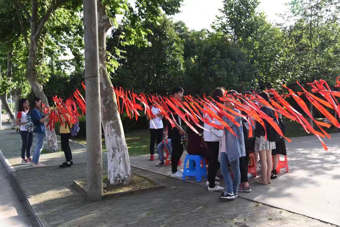 5月12日,湖北大学志愿者协会在通识学院举办了一次母亲节挂红丝带送祝福的活动。中午11:00—12:00和下午17:00—18:00,在排球场和问津苑门口都有值班人员引导同学写祝福语,挂红丝带。