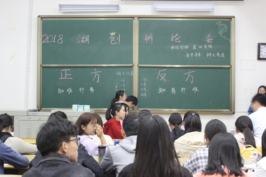 本场辩论赛由创业实践部实习部长舒畅、田腕君、刘鸿舜、邹雨欣四人主持策划,湖北大学创新创业俱乐部官方qq同步直播。比赛分为正反两方,正方所持观点为“知难行易”,反方为“知易行难”,双方各有四名辩手参赛。比赛共分为立论陈词、攻辩阶段、自由辩论和总结陈词四个环节。比赛过程当中八位选手旁征博引妙语连珠,对于古代思想大家王阳明,发明家爱迪生等名人事例选手们信手拈来。针对思想与实践两者孰重孰轻的辩论双方针锋相对,为观众带来了一场有理有据的精彩辩论。比赛尾声,由在场观众打分评选优胜方。最终,正方以较高得分获得这场辩论赛的胜利。