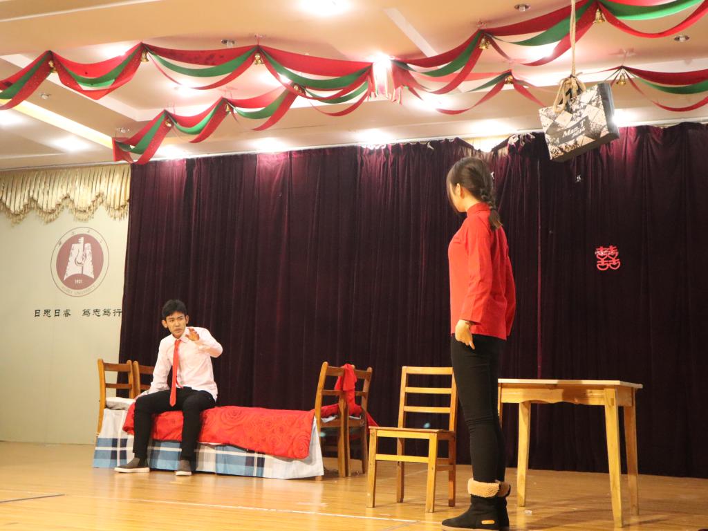 “我们结婚啦!今天我们结婚啦!”一阵吆喝传来,身穿大红色喜服演员,带着喜糖来到台前,朝台下撒了一把把糖,换来台下一阵又一阵掌声。这一幕发生在11月28日学院问津苑二楼,司南剧团在此开展主题为“感受生活、演出自我、秀出精彩”的话剧表演。