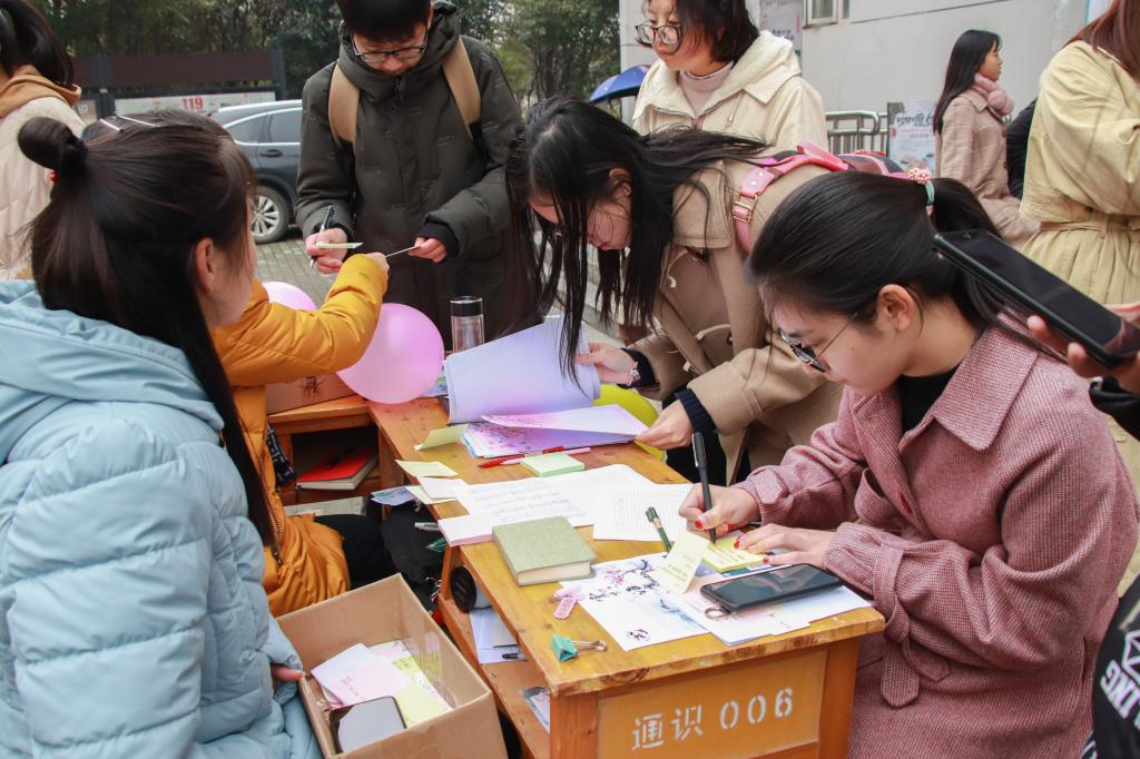 “君子坦荡荡,下一句是什么?”“小人长戚戚!”对诗成功赢得了观众的阵阵掌声。这是12月1日在问津苑侧门由书法协会举办的“云中谁寄锦书来”特色书信活动,诗词对接场面吸引了大量学生驻足参与。