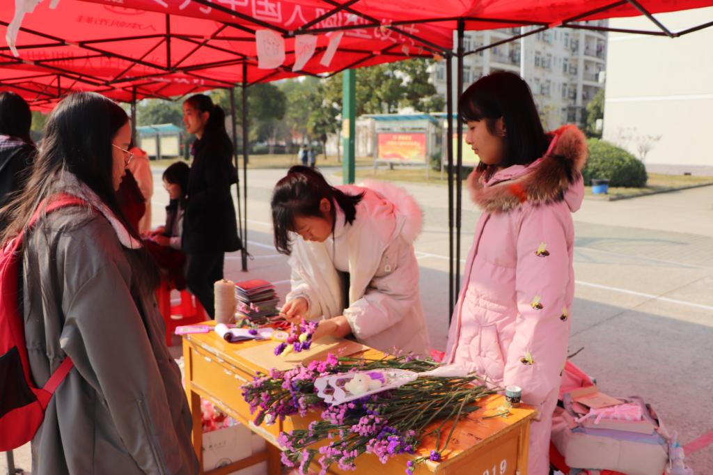 此次“创意市集”共有27个摊位,其中售卖满天星的摊点前尤为热闹。“顾客”们挑选出自己心仪的满天星,再由摊主包扎成束。为给参与学生提供才艺展示机会,摊位中央还摆放着话筒。《心愿》《我还年轻,我还年轻》……表演者一亮歌喉。箫笛、古筝也轮番上阵。不少学生闻声赶来,一探究竟。