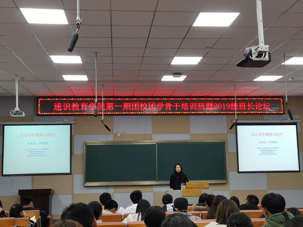 为帮助学生干部掌握公文写作基本知识,培养公文写作规范意识,提高公文写作与处理能力,12月11日19时,通识教育学院第一期团校团学骨干培训班暨2019级班长论坛第六讲——“公文写作规范与技巧”专题培训会在B300教室开讲。本次团课邀请到了湖北大学政法与公共管理学院李荣娟教授,通识教育学院第一期团校团学骨干培训班暨2019级班长论坛全体学员参加此次培训。通识教育学院团委书记吴玉莲担任主持人。