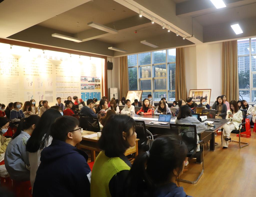 4月26日晚,湖北大学通识教育学院“读红色经典,学百年党史”读书分享会在B105通识记忆展厅开展。十名读书分享人和一众热爱读书的通识学子共聚一堂,展开热烈交流讨论,学院团委书记吴玉莲、习坎苑辅导员樊丽、润德苑辅导员段秋炯、思齐苑辅导员程垚瑞也一同参加,与通识学子共度思想碰撞的夜晚。