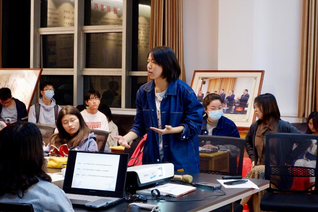 “《毛泽东选集》是思想的宝库,里面有很多论述对我们的学习生活都有启发,其中语言的使用也值得我们去研究。”除了陈述阅读《毛泽东选集》的意义,崔欣蕾还详细介绍了如何有技巧地阅读此书,她建议先阅读《实践论》和《矛盾论》,这两篇是一卷中作为结尾的文章,是一卷实践的升华和行为的指导,也是本书逻辑思维的起点。“可能有同学会觉得文章太长,读不下去,但我们应该像主席说的那样‘那又怎么样,看下去就是了!’希望大家都可以去看一看,活学活用,让生活更加丰富多彩。”说完,引发了阵阵掌声。